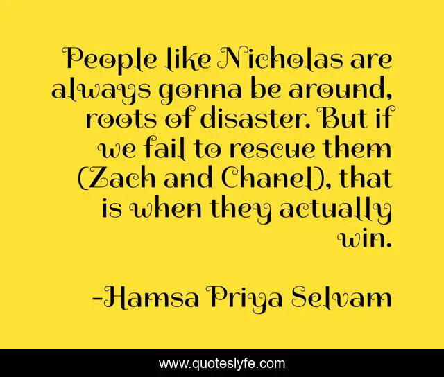This page presents the quote "People like Nicholas are always gonna be around, roots of disaster. But if we fail to rescue them (Zach and Chanel), that is when they actually win.". Author of this quote is Hamsa Priya Selvam. This quote is about fiction, friendship, loyalty, skylar-forbes,.