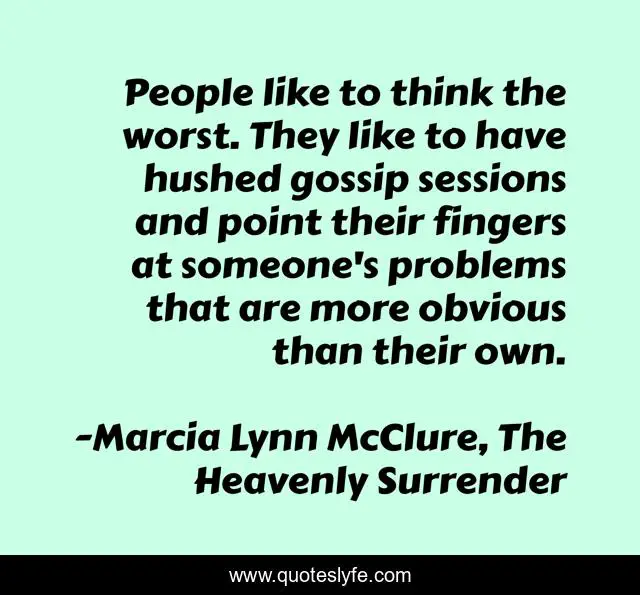 This page presents the quote "People like to think the worst. They like to have hushed gossip sessions and point their fingers at someone's problems that are more obvious than their own.". Author of this quote is Marcia Lynn McClure, The Heavenly Surrender. This quote is about gossip, marcia-lynn-mcclure, mrs-wilburn, problems, the-heavenly-surrender,.