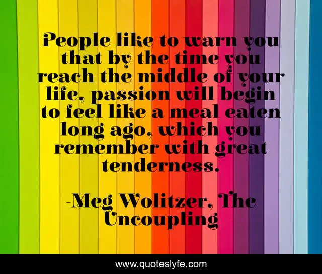 This page presents the quote "People like to warn you that by the time you reach the middle of your life, passion will begin to feel like a meal eaten long ago, which you remember with great tenderness.". Author of this quote is Meg Wolitzer, The Uncoupling. This quote is about emotion, life, remember, people, food, memory, eat, the-uncoupling, tenderness,.