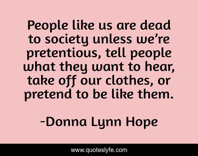 This page presents the quote "People like us are dead to society unless we’re pretentious, tell people what they want to hear, take off our clothes, or pretend to be like them.". Author of this quote is Donna Lynn Hope. This quote is about different, lonely, rejected, nonconformist, society, outcast, misfit, conformity,.