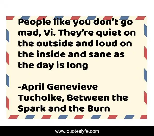 This page presents the quote "People like you don’t go mad, Vi. They’re quiet on the outside and loud on the inside and sane as the day is long". Author of this quote is April Genevieve Tucholke, Between the Spark and the Burn. This quote is about shyness, crazy, sane, madness, quiet,.