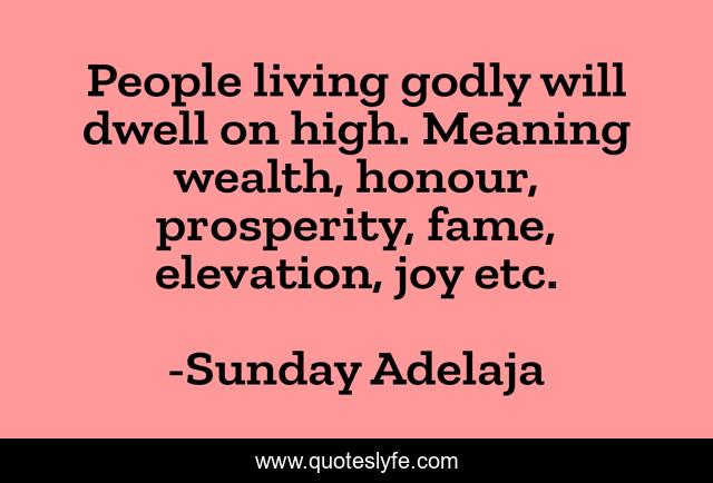 This page presents the quote "People living godly will dwell on high. Meaning wealth, honour, prosperity, fame, elevation, joy etc.". Author of this quote is Sunday Adelaja. This quote is about prosperity, elevation, wealth, people, honour, godly, joy, fame,.