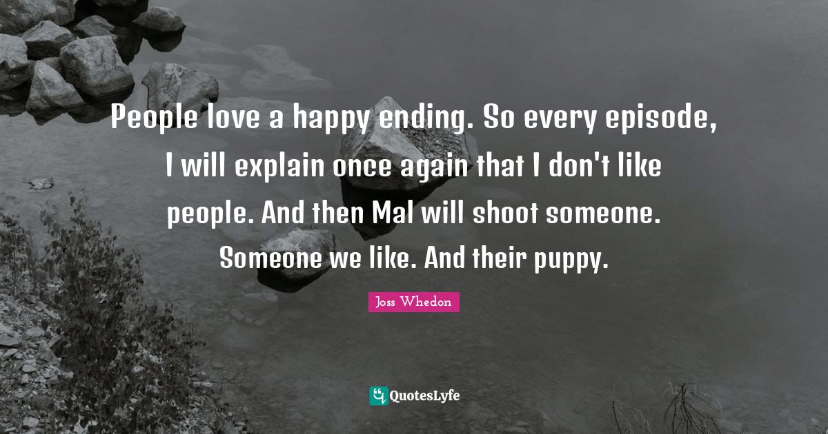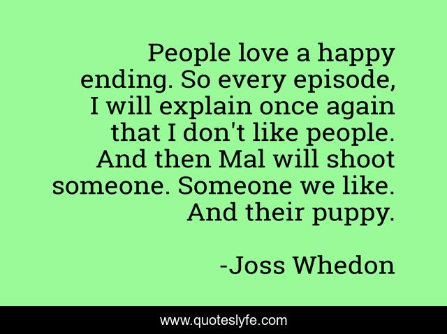 This page presents the quote "People love a happy ending. So every episode, I will explain once again that I don't like people. And then Mal will shoot someone. Someone we like. And their puppy.". Author of this quote is Joss Whedon. This quote is about television, writing,.