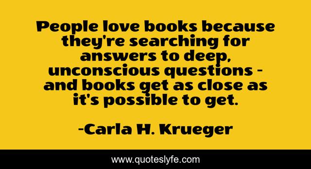 This page presents the quote "People love books because they're searching for answers to deep, unconscious questions - and books get as close as it's possible to get.". Author of this quote is Carla H. Krueger. This quote is about book, quotes-about-life, power-of-books, meaning-of-life, books-reading, carla-h-krueger,.