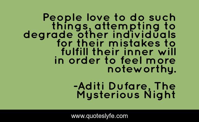 This page presents the quote "People love to do such things, attempting to degrade other individuals for their mistakes to fulfill their inner will in order to feel more noteworthy.". Author of this quote is Aditi Dufare, The Mysterious Night. This quote is about life, jealousy, fake-people, people,.