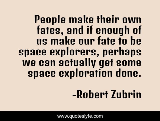 This page presents the quote "People make their own fates, and if enough of us make our fate to be space explorers, perhaps we can actually get some space exploration done.". Author of this quote is Robert Zubrin. This quote is about exploration, fate, people,.