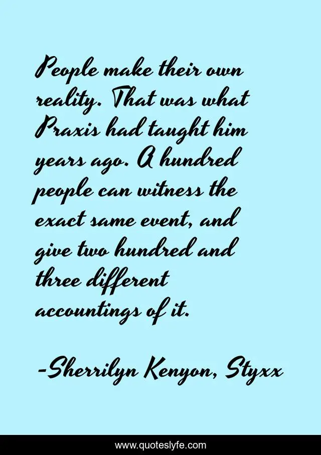 This page presents the quote "People make their own reality. That was what Praxis had taught him years ago. A hundred people can witness the exact same event, and give two hundred and three different accountings of it.". Author of this quote is Sherrilyn Kenyon, Styxx. This quote is about truth-of-life, reality,.