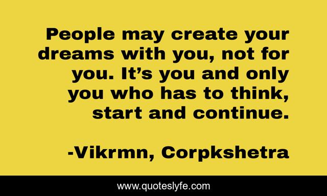 This page presents the quote "People may create your dreams with you, not for you. It’s you and only you who has to think, start and continue.". Author of this quote is Vikrmn, Corpkshetra. This quote is about corpkshetra, confidence, think, vikram, continue, people, positive, create, motivational,.