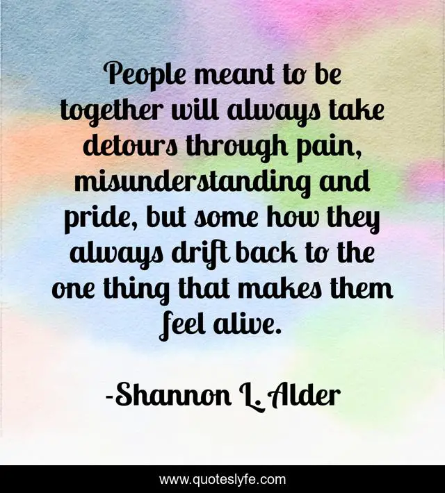 This page presents the quote "People meant to be together will always take detours through pain, misunderstanding and pride, but some how they always drift back to the one thing that makes them feel alive.". Author of this quote is Shannon L. Alder. This quote is about caring, love, alive, relationships-101, soulmate, affection,.