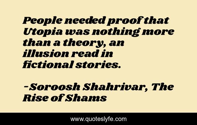 This page presents the quote "People needed proof that Utopia was nothing more than a theory, an illusion read in fictional stories.". Author of this quote is Soroosh Shahrivar, The Rise of Shams. This quote is about cynicism-reality, the-rise-of-shams, utopia, illusion,.