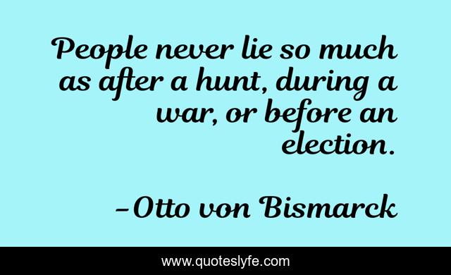 This page presents the quote "People never lie so much as after a hunt, during a war, or before an election.". Author of this quote is Otto von Bismarck. This quote is about hunting, people, war, lying, elections,.