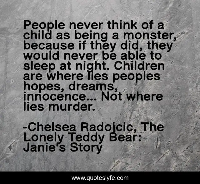 This page presents the quote "People never think of a child as being a monster, because if they did, they would never be able to sleep at night. Children are where lies peoples hopes, dreams, innocence... Not where lies murder.". Author of this quote is Chelsea Radojcic, The Lonely Teddy Bear: Janie's Story. This quote is about murder, fire, horror, revenge, murder-mystery, thriller,.