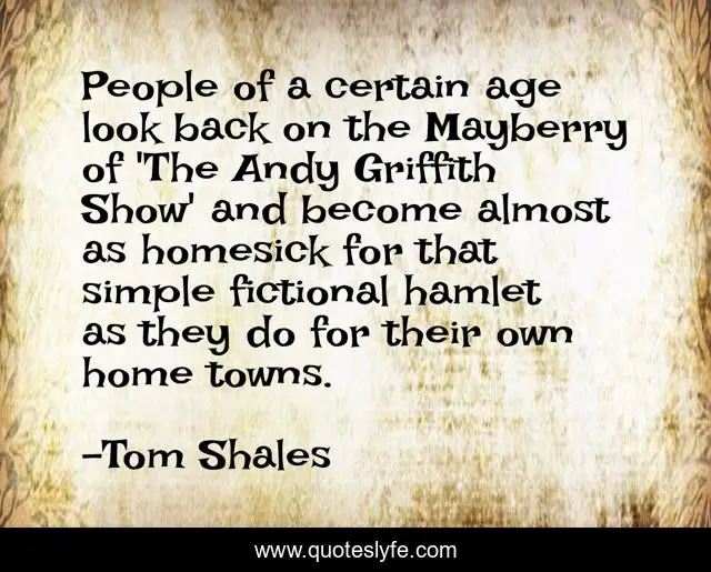 This page presents the quote "People of a certain age look back on the Mayberry of 'The Andy Griffith Show' and become almost as homesick for that simple fictional hamlet as they do for their own home towns.". Author of this quote is Tom Shales. This quote is about simple, home, people,.