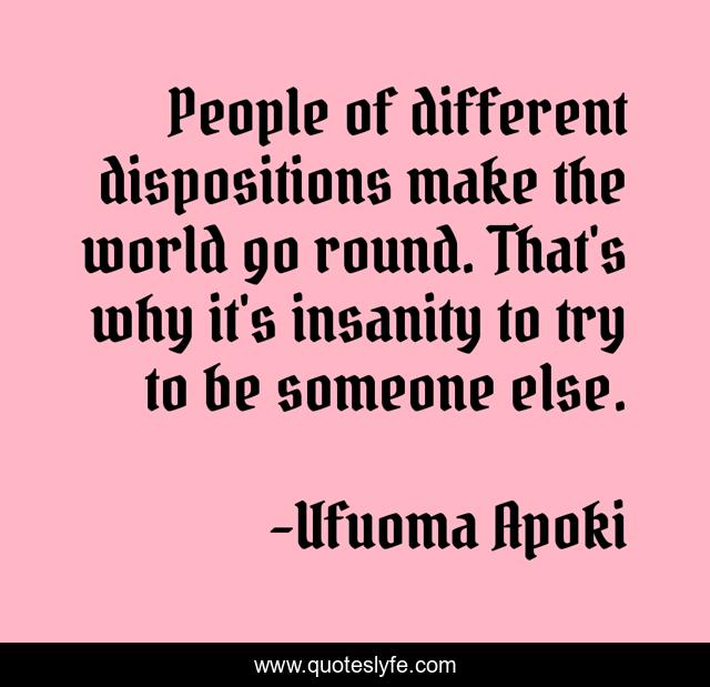 This page presents the quote "People of different dispositions make the world go round. That's why it's insanity to try to be someone else.". Author of this quote is Ufuoma Apoki. This quote is about be-confident, be-you, be-yourself, originality, imitation-is-limitation, be-real,.