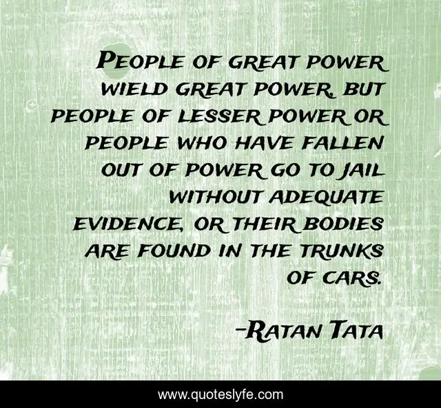 This page presents the quote "People of great power wield great power, but people of lesser power or people who have fallen out of power go to jail without adequate evidence, or their bodies are found in the trunks of cars.". Author of this quote is Ratan Tata. This quote is about great, power, people,.