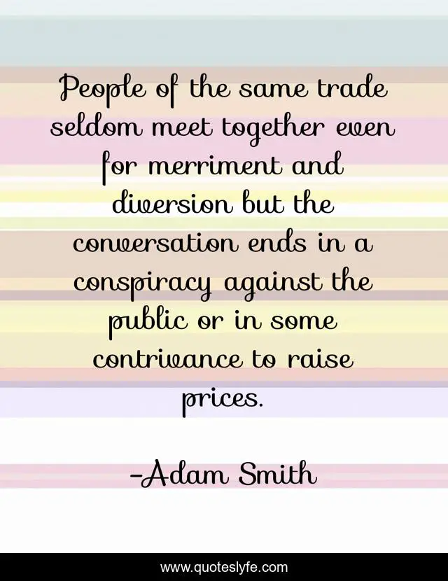 This page presents the quote "People of the same trade seldom meet together even for merriment and diversion but the conversation ends in a conspiracy against the public or in some contrivance to raise prices.". Author of this quote is Adam Smith. .