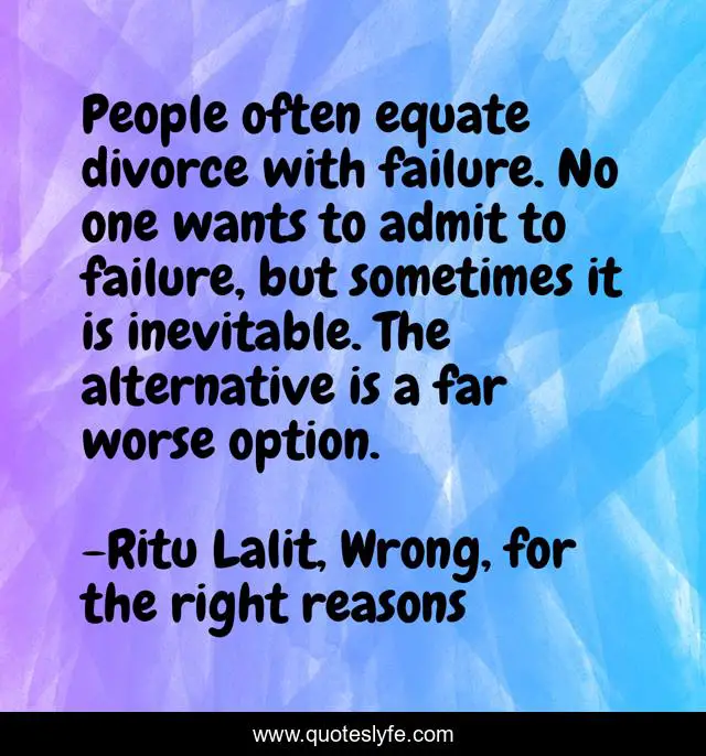 This page presents the quote "People often equate divorce with failure. No one wants to admit to failure, but sometimes it is inevitable. The alternative is a far worse option.". Author of this quote is Ritu Lalit, Wrong, for the right reasons. .