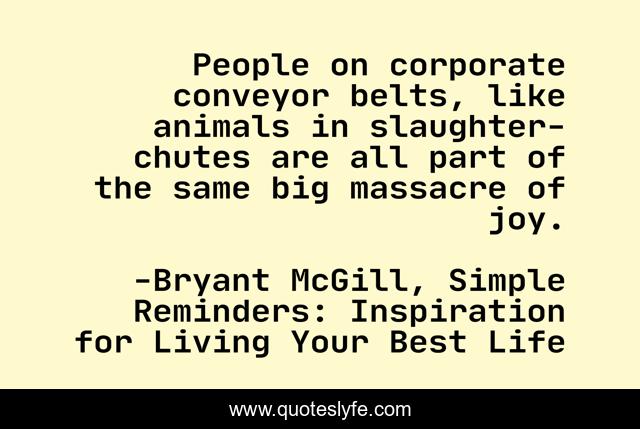 This page presents the quote "People on corporate conveyor belts, like animals in slaughter-chutes are all part of the same big massacre of joy.". Author of this quote is Bryant McGill, Simple Reminders: Inspiration for Living Your Best Life. This quote is about animals, slaughtering, people, joy, massacre, corporations,.