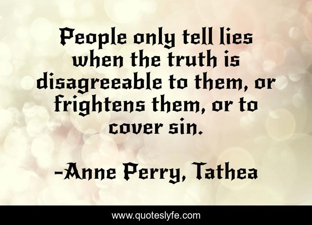 This page presents the quote "People only tell lies when the truth is disagreeable to them, or frightens them, or to cover sin.". Author of this quote is Anne Perry, Tathea. This quote is about lie, sin, truth,.
