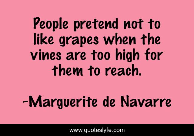 This page presents the quote "People pretend not to like grapes when the vines are too high for them to reach.". Author of this quote is Marguerite de Navarre. This quote is about medieval, vines, troubador, french, grapes, effort, achievement,.