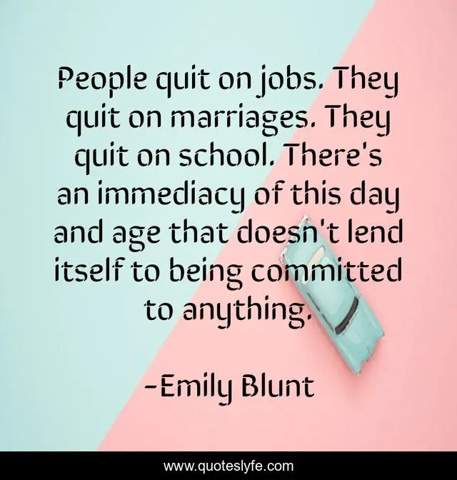 This page presents the quote "People quit on jobs. They quit on marriages. They quit on school. There's an immediacy of this day and age that doesn't lend itself to being committed to anything.". Author of this quote is Emily Blunt. This quote is about school, day, people,.