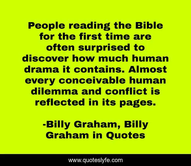 This page presents the quote "People reading the Bible for the first time are often surprised to discover how much human drama it contains. Almost every conceivable human dilemma and conflict is reflected in its pages.". Author of this quote is Billy Graham, Billy Graham in Quotes. This quote is about bible, billy-graham,.