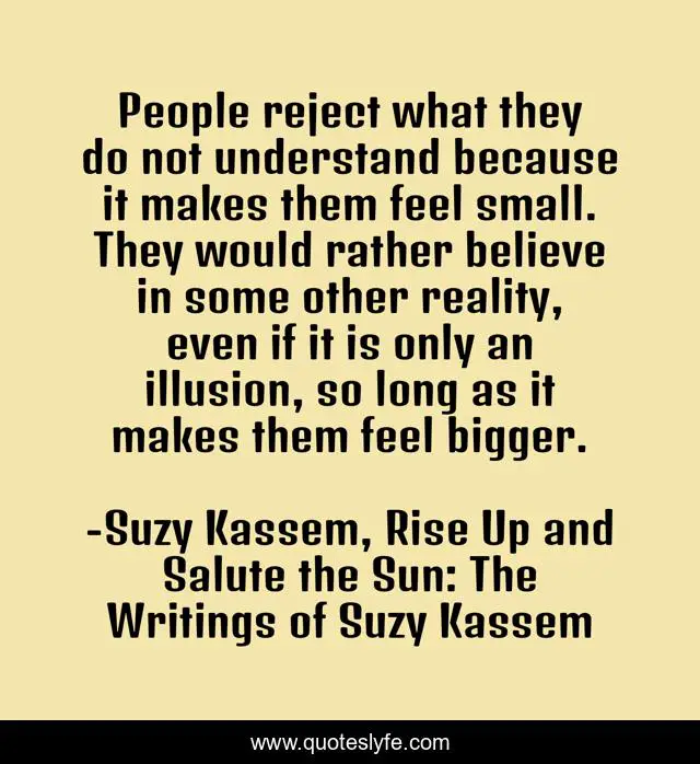 This page presents the quote "People reject what they do not understand because it makes them feel small. They would rather believe in some other reality, even if it is only an illusion, so long as it makes them feel bigger.". Author of this quote is Suzy Kassem, Rise Up and Salute the Sun: The Writings of Suzy Kassem. This quote is about delusion, ego, ignorance, reality,.