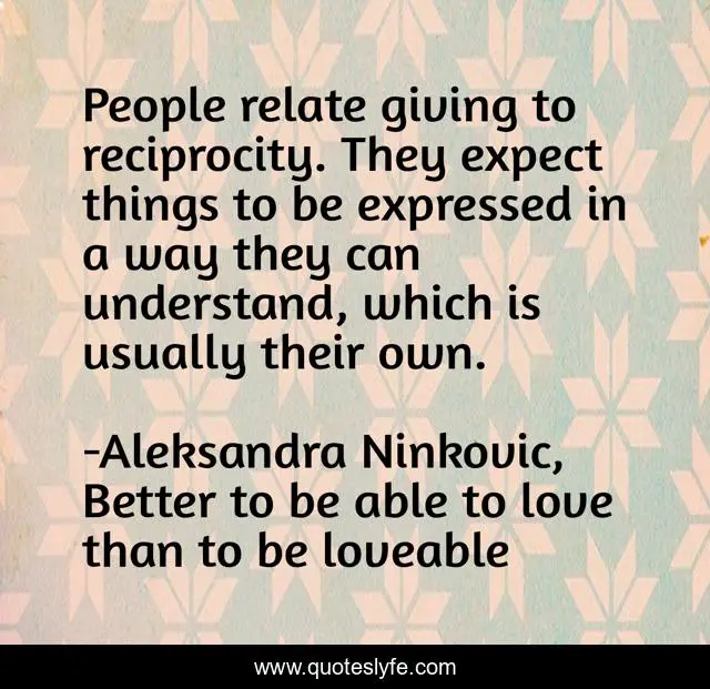 "Aleksandra Ninkovic, Better to be able to love than to be loveable Quotes." Quoteslyfe.com, 2025. Sat. 06 Dec. 2025. <https://www.quoteslyfe.com/quote/People-relate-giving-to-reciprocity-They-expect-156806>.