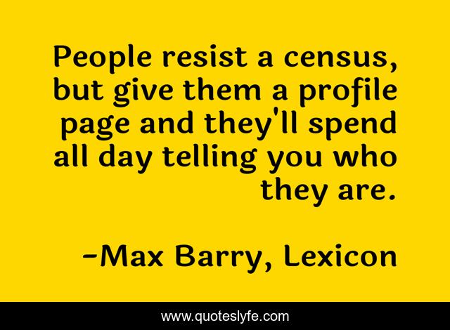 "Max Barry, Lexicon Quotes." Quoteslyfe.com, 2025. Mon. 08 Dec. 2025. <https://www.quoteslyfe.com/quote/People-resist-a-census-but-give-them-9256>.