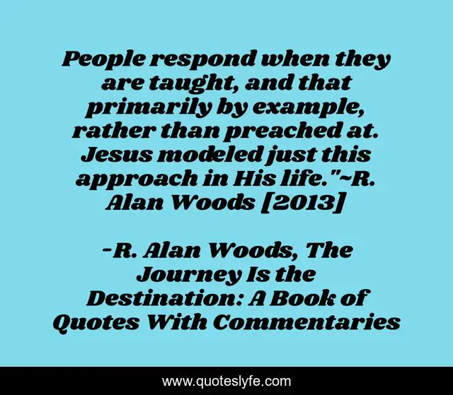This page presents the quote "People respond when they are taught, and that primarily by example, rather than preached at. Jesus modeled just this approach in His life."~R. Alan Woods [2013]". Author of this quote is R. Alan Woods, The Journey Is the Destination: A Book of Quotes With Commentaries. This quote is about by-example, teaching, teach, r-alan-woods, teaching-the-faith,.
