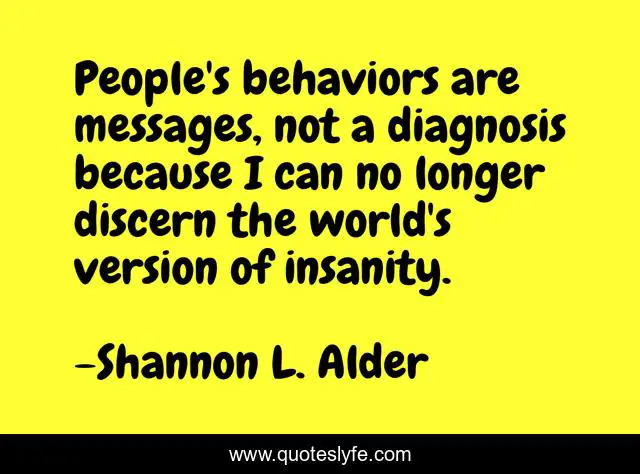 This page presents the quote "People's behaviors are messages, not a diagnosis because I can no longer discern the world's version of insanity.". Author of this quote is Shannon L. Alder. This quote is about heartless, lies, me-complex, medical-malpractice, selfishness, immaturity, fear, infidelity, denial,.