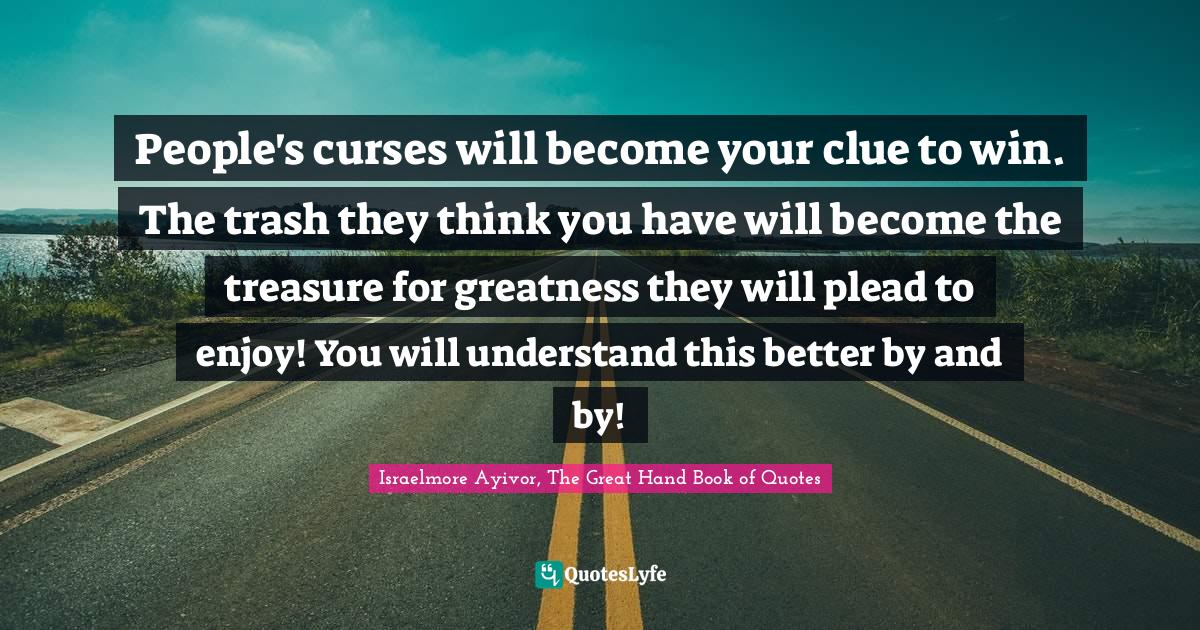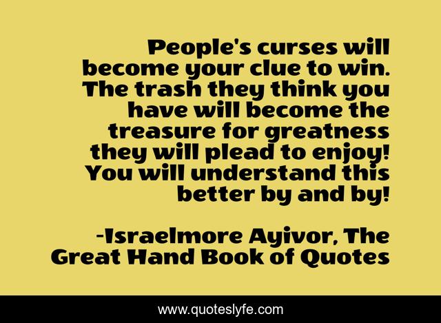 This page presents the quote "People's curses will become your clue to win. The trash they think you have will become the treasure for greatness they will plead to enjoy! You will understand this better by and by!". Author of this quote is Israelmore Ayivor, The Great Hand Book of Quotes. This quote is about food-for-thought, curse, israelmore-ayivor, curses, great-things, win, by-and-by, winner, people,.