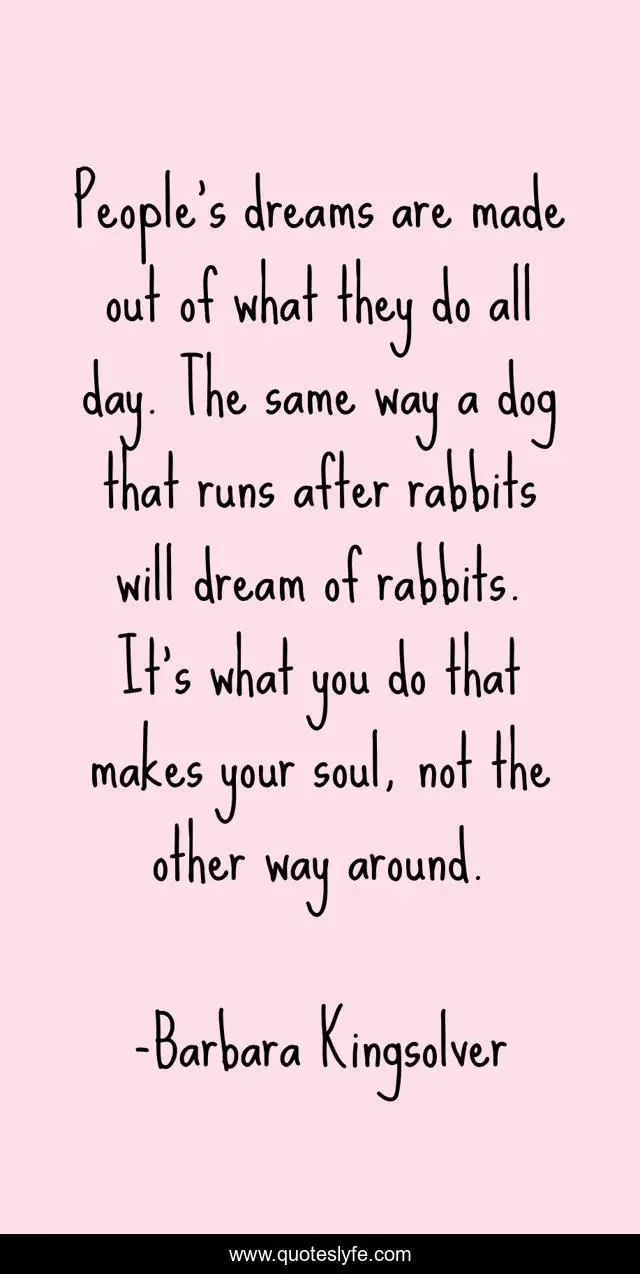 This page presents the quote "People's dreams are made out of what they do all day. The same way a dog that runs after rabbits will dream of rabbits. It's what you do that makes your soul, not the other way around.". Author of this quote is Barbara Kingsolver. This quote is about dog, day, soul,.