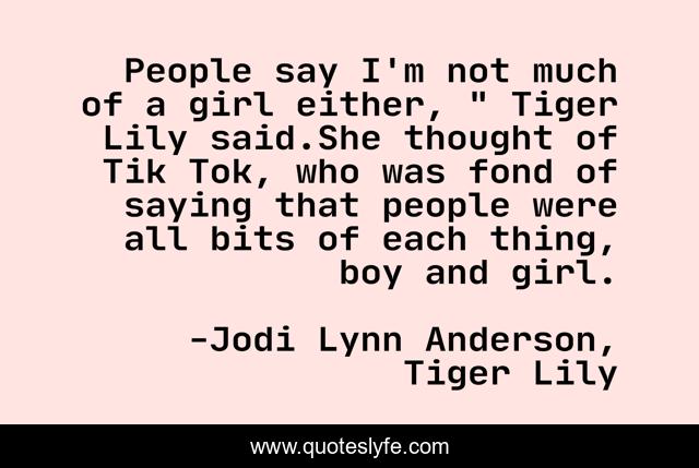 This page presents the quote "People say I'm not much of a girl either, " Tiger Lily said.She thought of Tik Tok, who was fond of saying that people were all bits of each thing, boy and girl.". Author of this quote is Jodi Lynn Anderson, Tiger Lily. This quote is about tiger-lily, boy, girl, gender,.