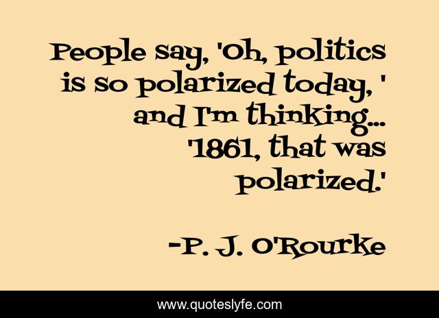 This page presents the quote "People say, 'Oh, politics is so polarized today, ' and I'm thinking... '1861, that was polarized.'". Author of this quote is P. J. O'Rourke. This quote is about thinking, today, people,.