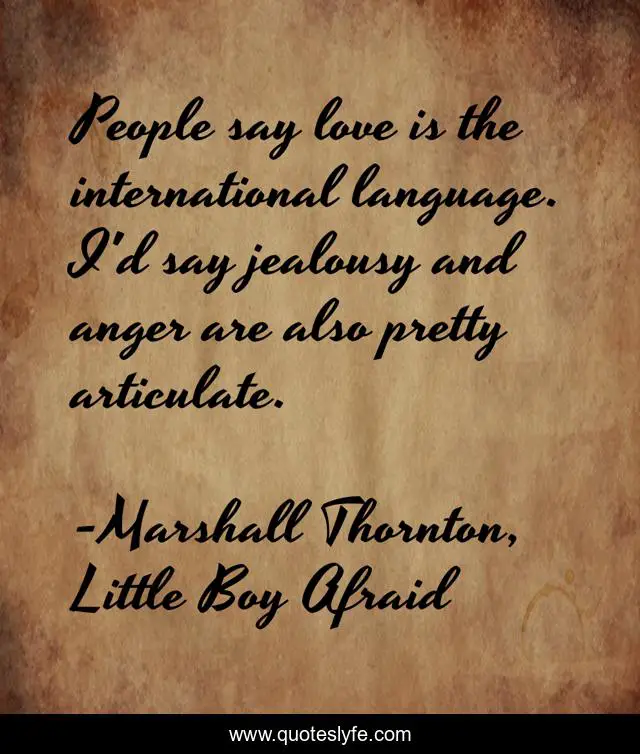 This page presents the quote "People say love is the international language. I'd say jealousy and anger are also pretty articulate.". Author of this quote is Marshall Thornton, Little Boy Afraid. This quote is about jealousy, nick-nowak,.