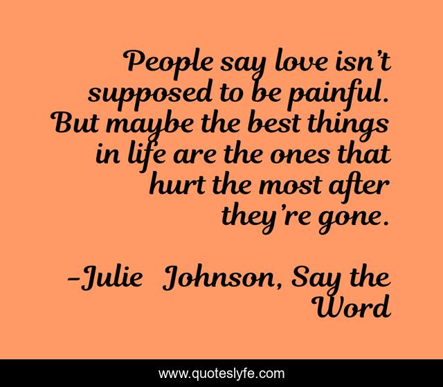 This page presents the quote "People say love isn’t supposed to be painful. But maybe the best things in life are the ones that hurt the most after they’re gone.". Author of this quote is Julie Johnson, Say the Word. This quote is about love, heartbreak, pain, affection, second-chance,.