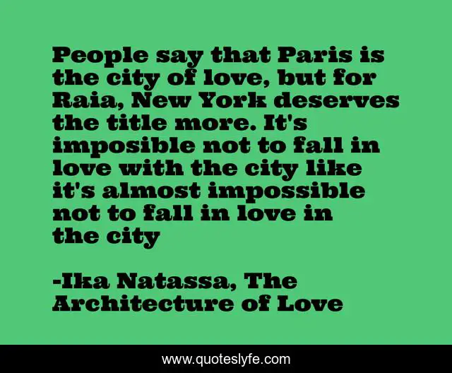 This page presents the quote "People say that Paris is the city of love, but for Raia, New York deserves the title more. It's imposible not to fall in love with the city like it's almost impossible not to fall in love in the city". Author of this quote is Ika Natassa, The Architecture of Love. This quote is about fall-in-love, new-york-city, love, affection,.
