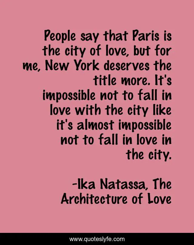 This page presents the quote "People say that Paris is the city of love, but for me, New York deserves the title more. It's impossible not to fall in love with the city like it's almost impossible not to fall in love in the city.". Author of this quote is Ika Natassa, The Architecture of Love. .