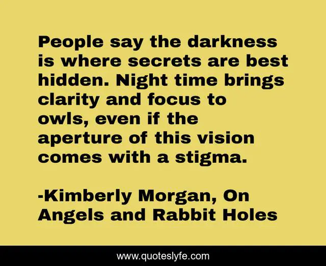 This page presents the quote "People say the darkness is where secrets are best hidden. Night time brings clarity and focus to owls, even if the aperture of this vision comes with a stigma.". Author of this quote is Kimberly Morgan, On Angels and Rabbit Holes. This quote is about perception, secrets, owls, night, stigma, clarity,.
