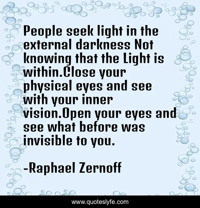 This page presents the quote "People seek light in the external darkness Not knowing that the Light is within.Close your physical eyes and see with your inner vision.Open your eyes and see what before was invisible to you.". Author of this quote is Raphael Zernoff. This quote is about life-coaching, self-awareness, consciousness, wisdom, spirituality, self-help, raphael-zernoff,.