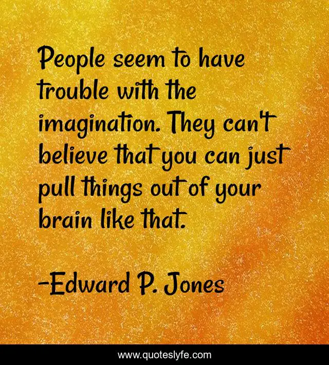 This page presents the quote "People seem to have trouble with the imagination. They can't believe that you can just pull things out of your brain like that.". Author of this quote is Edward P. Jones. This quote is about brain, believe, people,.