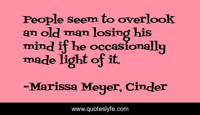 This page presents the quote "People seem to overlook an old man losing his mind if he occasionally made light of it.". Author of this quote is Marissa Meyer, Cinder. This quote is about humor, honesty, insanity,.