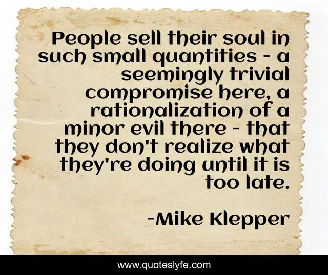 This page presents the quote "People sell their soul in such small quantities - a seemingly trivial compromise here, a rationalization of a minor evil there - that they don't realize what they're doing until it is too late.". Author of this quote is Mike Klepper. This quote is about actions-and-consequences, compromise, integrity, evil, selling-your-soul,.