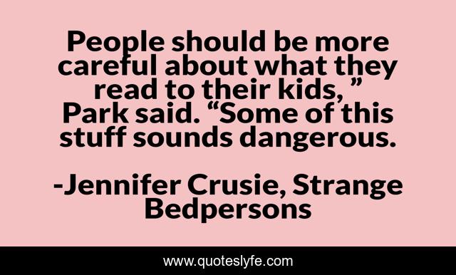 This page presents the quote "People should be more careful about what they read to their kids, ” Park said. “Some of this stuff sounds dangerous.". Author of this quote is Jennifer Crusie, Strange Bedpersons. This quote is about read, dangerous, danger, books, kids,.