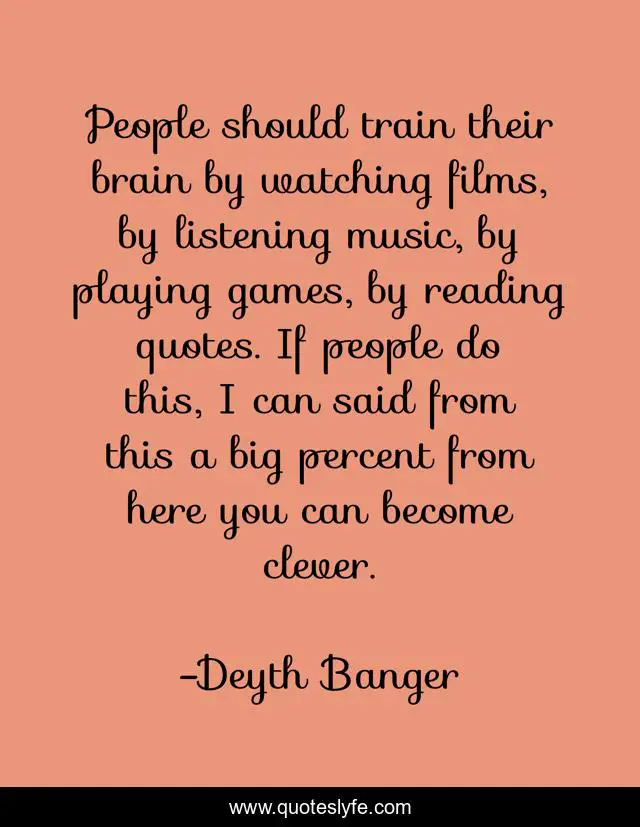 This page presents the quote "People should train their brain by watching films, by listening music, by playing games, by reading quotes. If people do this, I can said from this a big percent from here you can become clever.". Author of this quote is Deyth Banger. This quote is about clever, brains, brain, music, films, smart,.