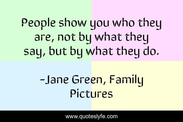 This page presents the quote "People show you who they are, not by what they say, but by what they do.". Author of this quote is Jane Green, Family Pictures. This quote is about life, fraud, love, family, betrayal, bigamy, husband, affection,.