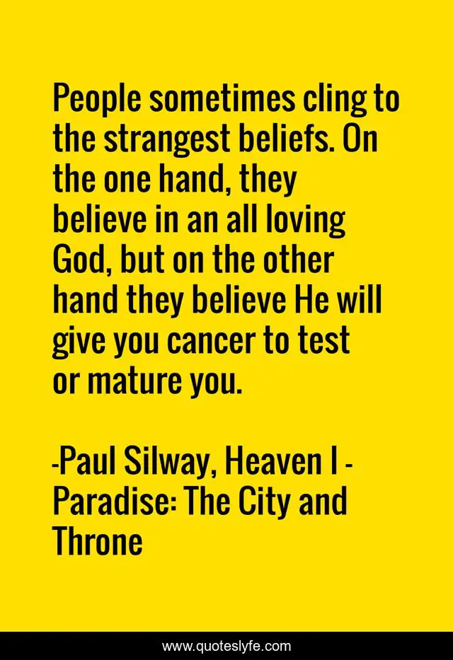 This page presents the quote "People sometimes cling to the strangest beliefs. On the one hand, they believe in an all loving God, but on the other hand they believe He will give you cancer to test or mature you.". Author of this quote is Paul Silway, Heaven I - Paradise: The City and Throne. .
