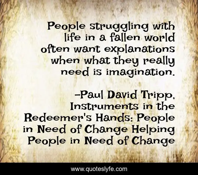 This page presents the quote "People struggling with life in a fallen world often want explanations when what they really need is imagination.". Author of this quote is Paul David Tripp, Instruments in the Redeemer's Hands: People in Need of Change Helping People in Need of Change. This quote is about imaginations, explanation, fallen, struggling, people,.