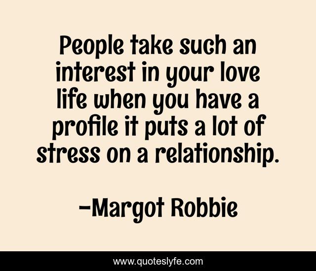 This page presents the quote "People take such an interest in your love life when you have a profile it puts a lot of stress on a relationship.". Author of this quote is Margot Robbie. This quote is about life, love, stress, affection,.